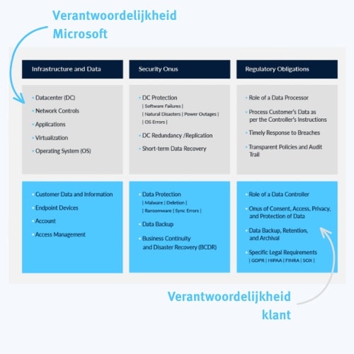 Microsoft biedt uitstekende uptime, redundantie en beveiliging van hun infrastructuur die achter hun clouddiensten zit. Maar ze beschermen jouw data niet tegen: