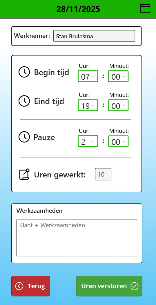 Registreren van gewerkte uren met starttijd, eindtijd, pauzetijd en omschrijving van de werkzaamheden